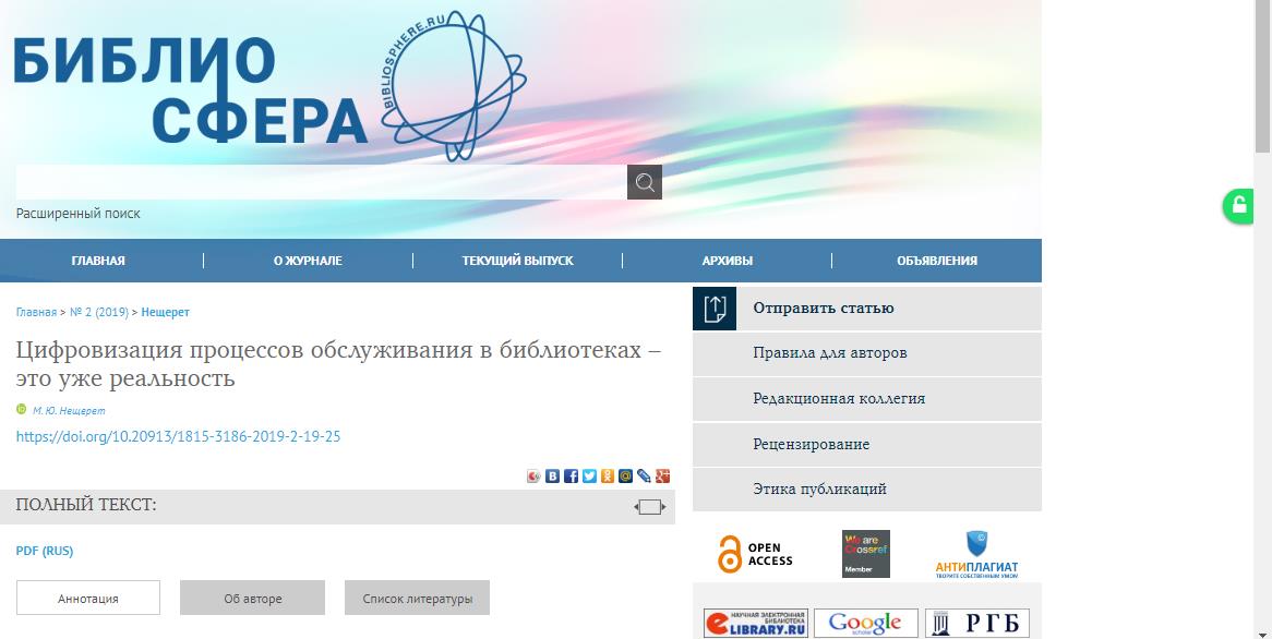 Рис. 2. Статья из журнала «Библиосфера» на платформе Elpub