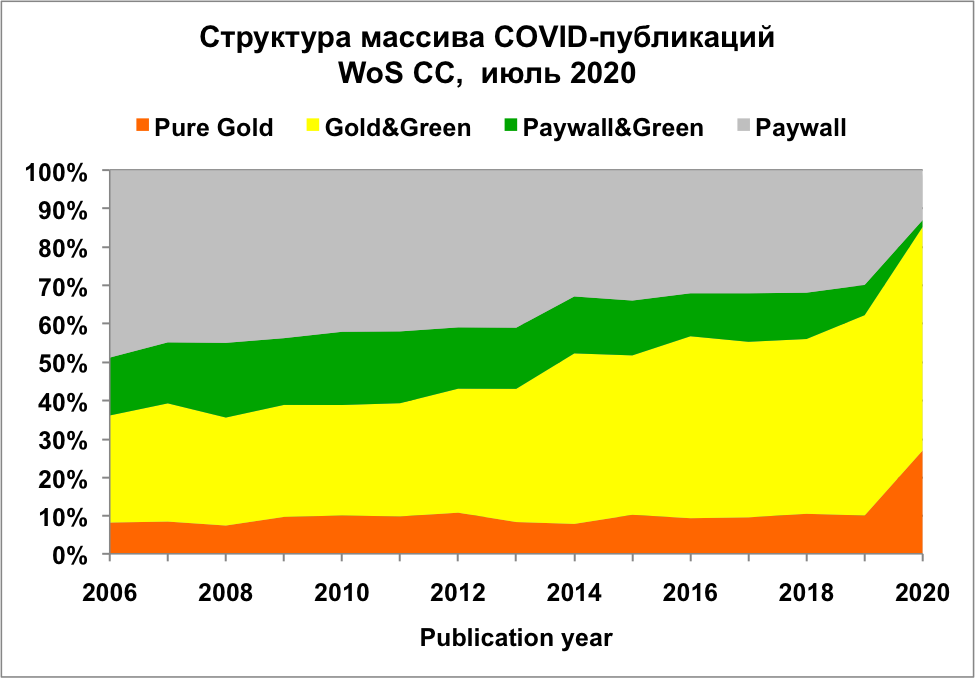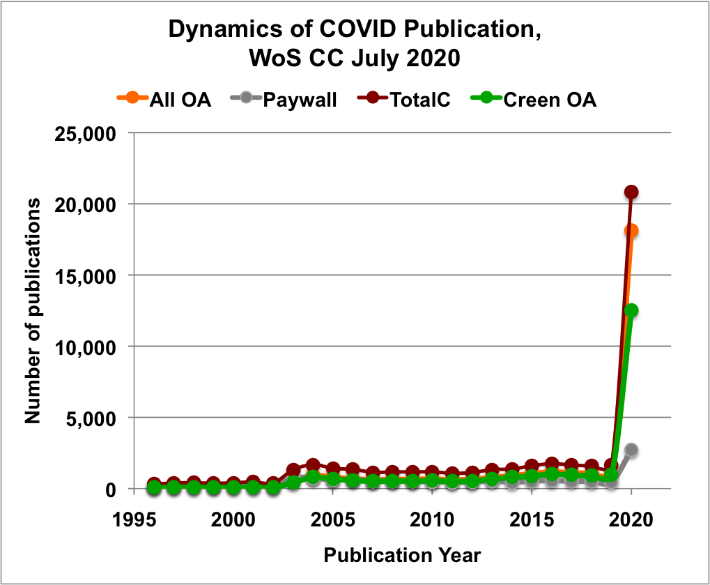 Результаты и обсуждение. Пандемия нового коронавируса привела к сверхлинейному росту числа COVID-публикаций, датированных 2020 годом. Проблемы самоизоляции привели к удвоению числа  публикаций в области общественных наук в классификации Essencial Science Indicators. Анализ структуры  публикаций 2020 года показал, что в открытом доступе находятся 36 % всех статей WoS CC и 87 % COVID-статей. При этом статьи ОД, существующие в единичной копии на платформе журнала, составляют основную долю (20 %) публикаций WoS CC, а статьи ОД, доступные во множественных копиях  на платформе журнала и в репозиториях, — основную долю (60 %) COVID-публикаций.