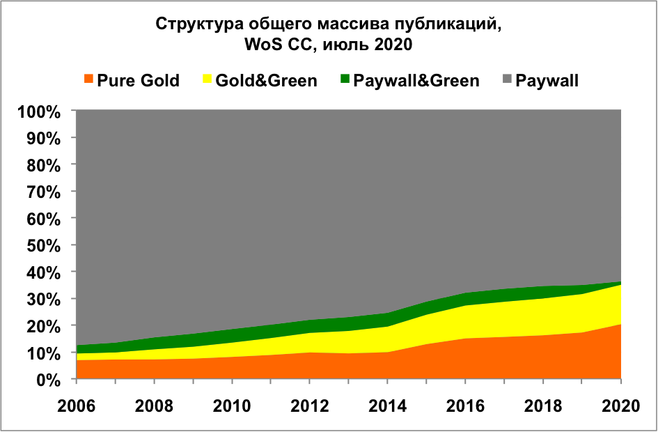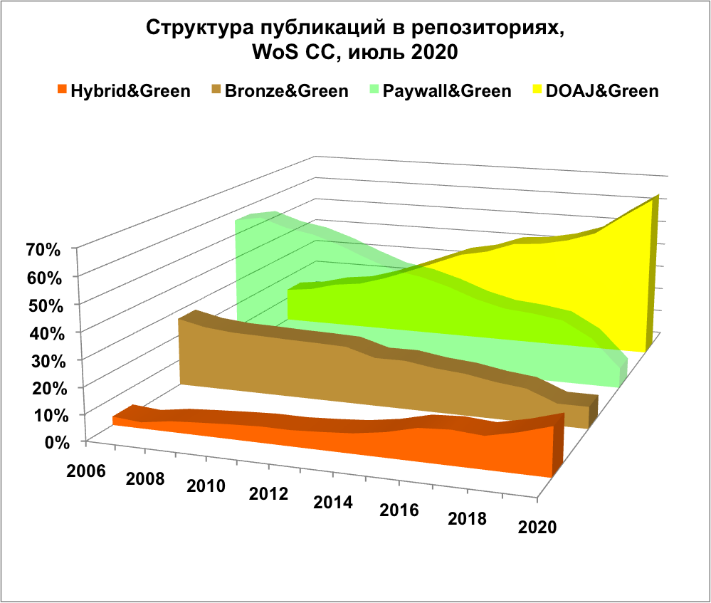 В 2006 году репозитории ОД пополнялись в основном за счет самоархивирования публикаций из платных  журналов; в 2020 году основным источником пополнения репозиториев стали журнальные публикации  ОД. Они составили 92 и 97 % всех поступлений из WoS CC и COVID-публикаций 2020 года.