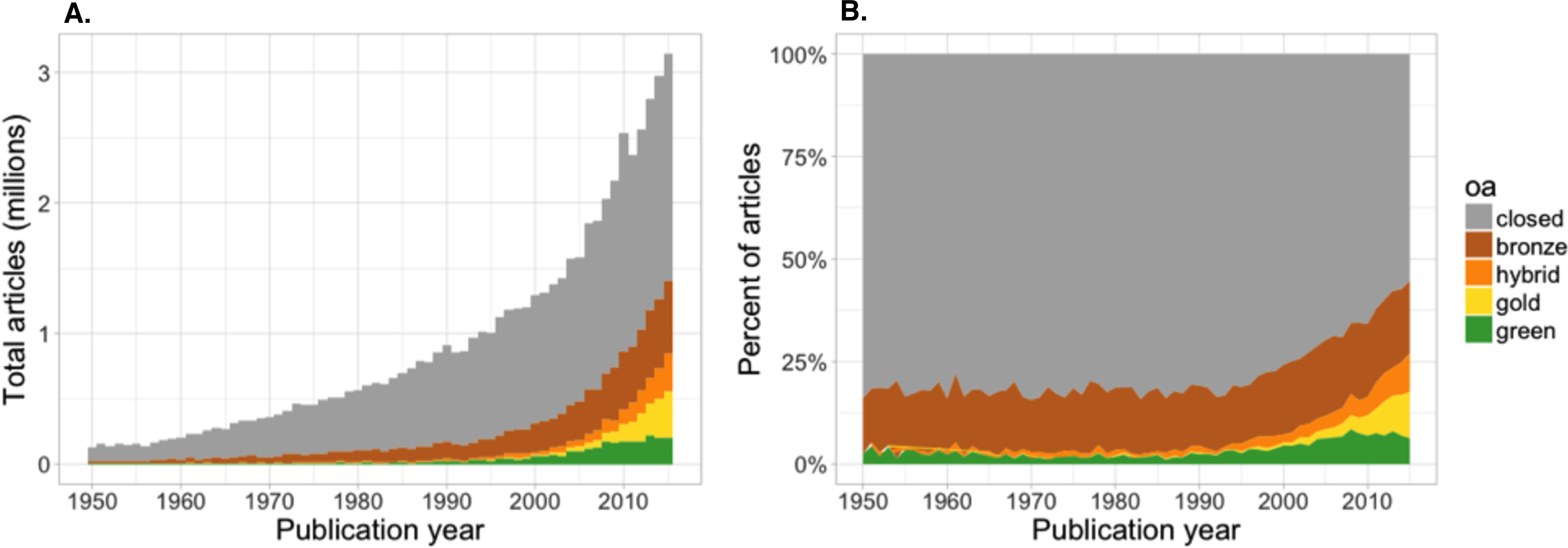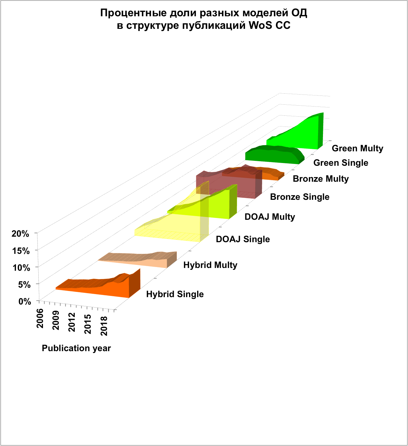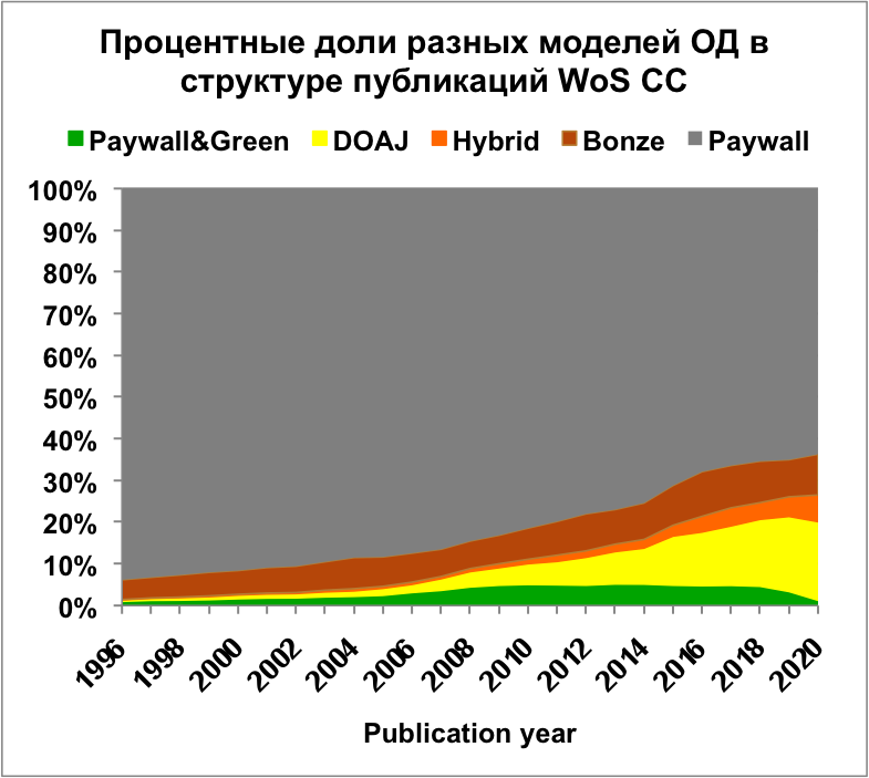 Изменения в экосистеме открытого доступа привели к росту доли статей открытого доступа в мировом потоке публикаций. Общая доля научной литературы, доступной в ОД оценивалась во многих работах, в том числе в [16-22]. До 2018 года в индексах цитирования не было возможности подсчета числа статей ОД в гибридных журналах. В 2018 году сервисы Web of Science, а позднее и InCites начали предоставлять данные о числе отдельных статей в категориях DOAJ Gold, Other Gold (Hybrid), Bronze, Green Published / Green Accepted по всему набору данных WoS CC. Эта возможность упростила анализ и добавила новые статьи в исследуемые массивы публикаций. В работе [23] по ситуации на третий квартал 2016 года для статей, опубликованных в 2009-2014 гг. в базах данных WoS CC и 1science, процент статей открытого доступа варьировался от 55 до 57 %. Масштабный анализ, проведенный в [21], показал, что ОД публикации составляют 28 % массива 19M публикаций, и эта доля растет. Авторы сообщили, что доля статей открытого доступа в публикациях 2015 года составила 45 %. В [22] сообщается о 31 % журнальных статей в 2019 году и было предсказано, что к 2025 году 44 % всех журнальных статей будут доступны в ОД.