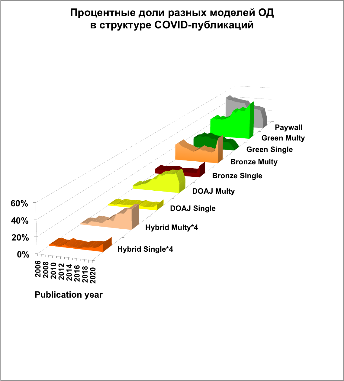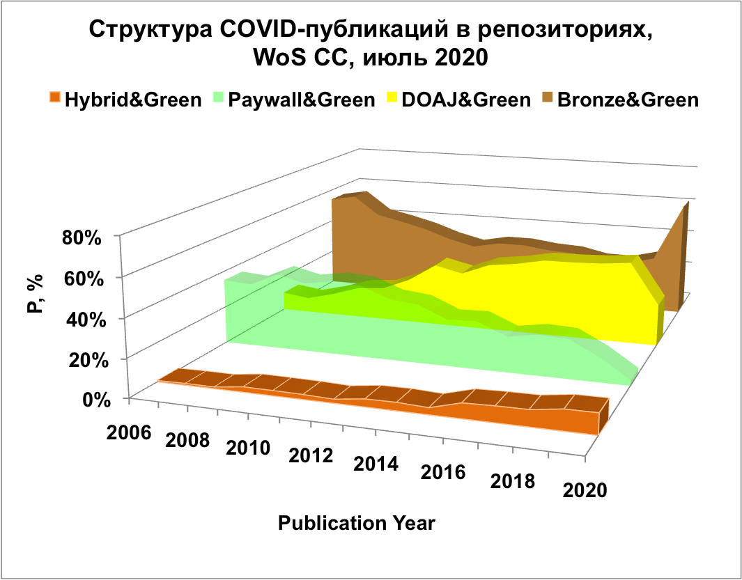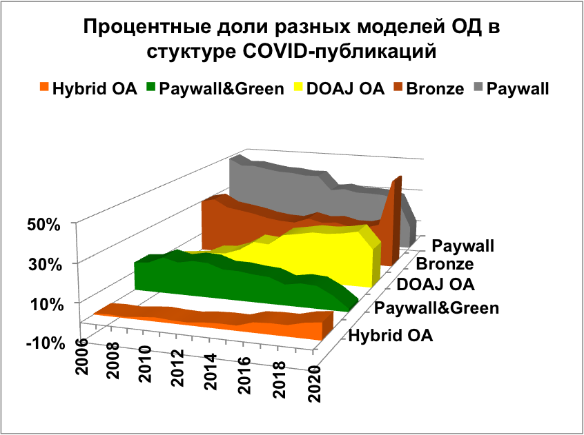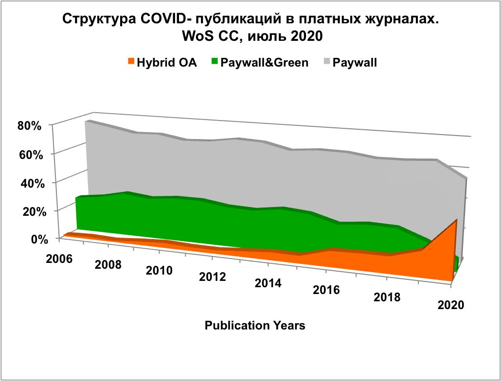 Изменилась структура COVID-публикаций в гибридных и подписных журналах: в 2020 году 38 % статей в таких журналах были опубликованы в гибридном ОД. Для 2018 года эта цифра равна 12 %. Доля статей «закрытого доступа», размещенных в репозиториях после истечения периода эмбарго, остается  низкой по сравнению с возможностями для самоархивирования, предоставляемыми издателями.