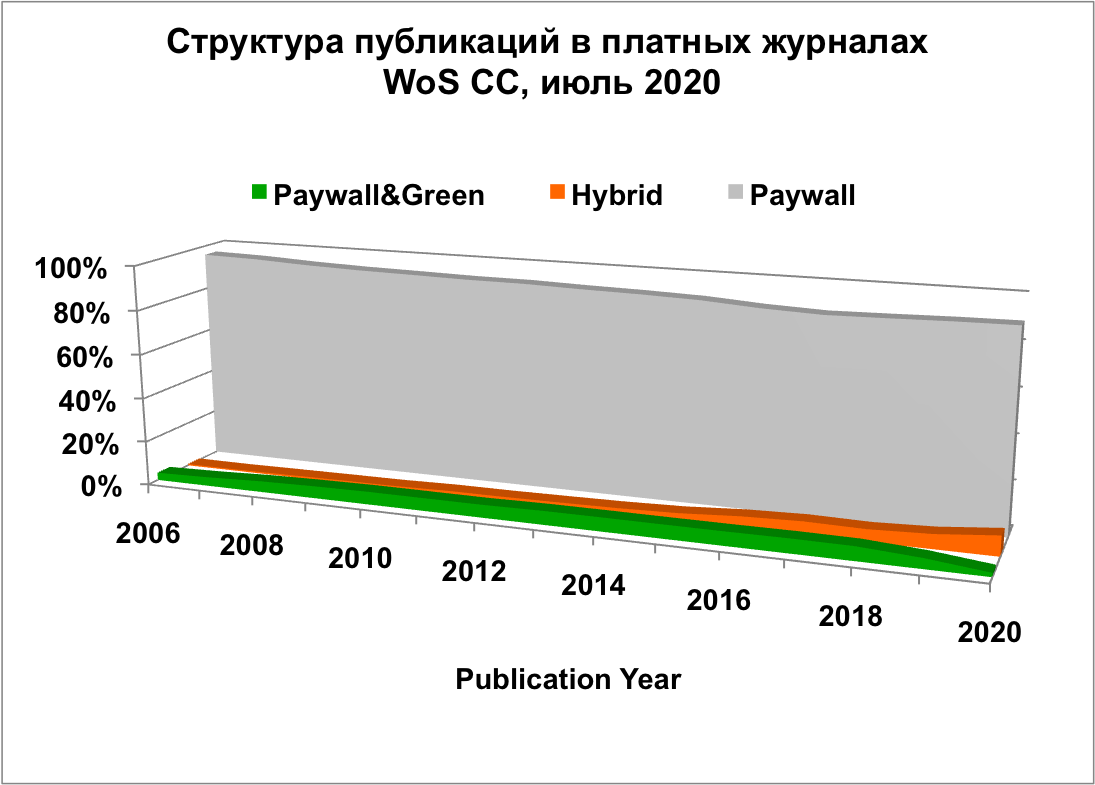 При исследовании структуры публикаций в платных, в том числе и гибридных, журналах общее число платных публикаций рассчитывалось как (Paywall&Green+Paywall+Hybrid). Далее мы определили, какую процентную долю этих публикаций авторы оставляют в закрытом доступе (Paywall), какую размещают в репозиториях ОД после истечения периода эмбарго (Paywall&Green), а какую переводят в гибридный ОД (Hybrid) после уплаты издательству Article Processing Charge, APC.